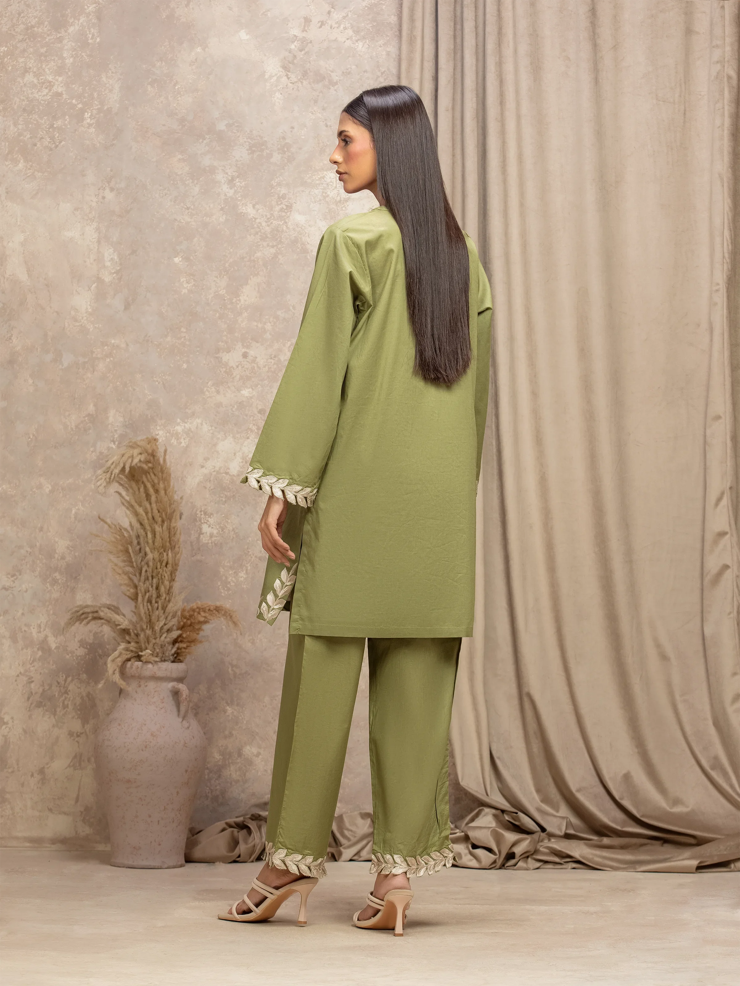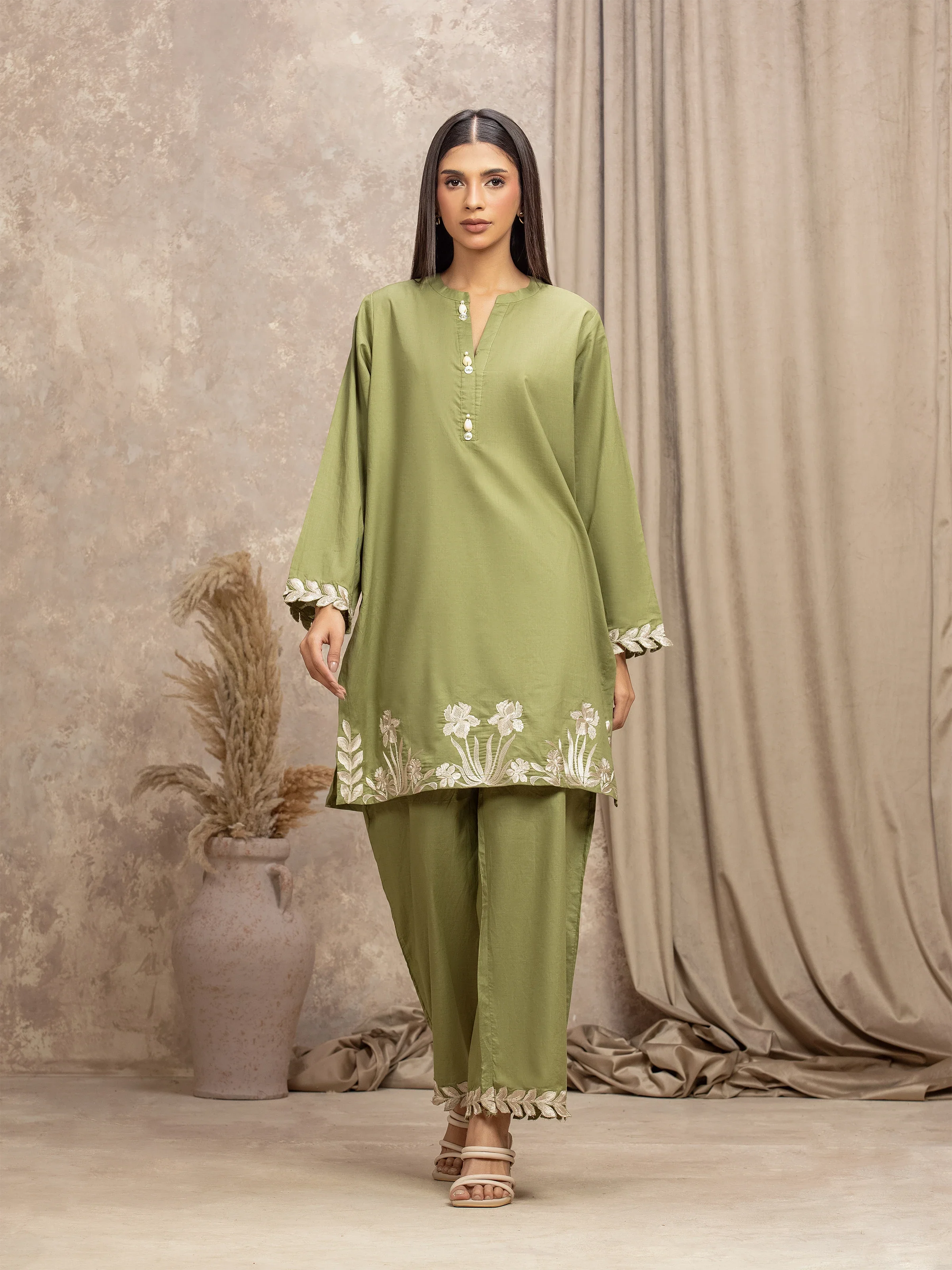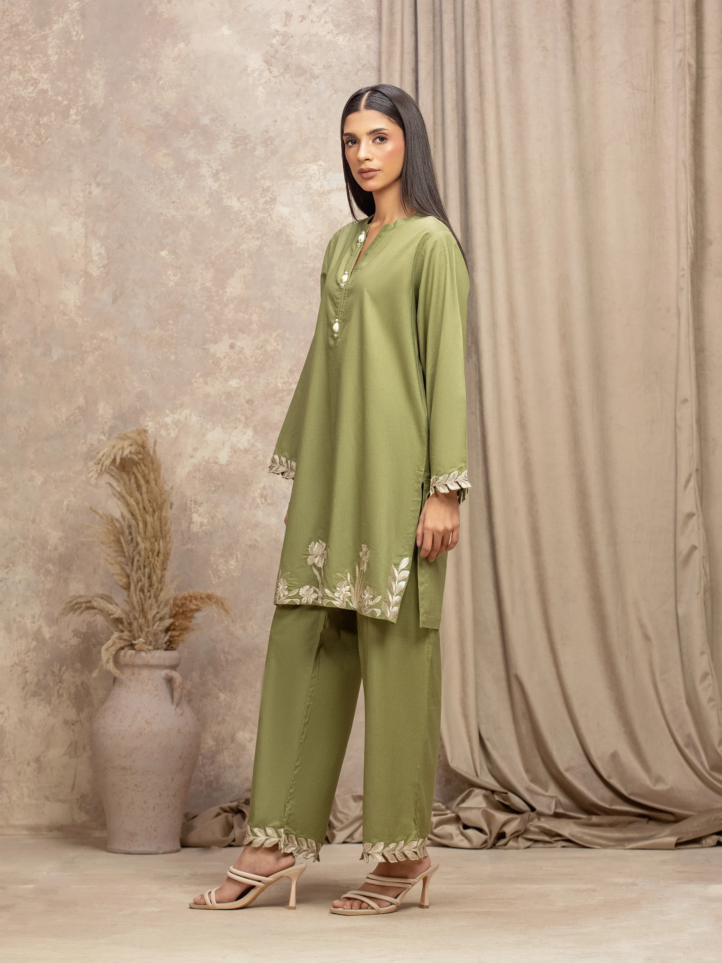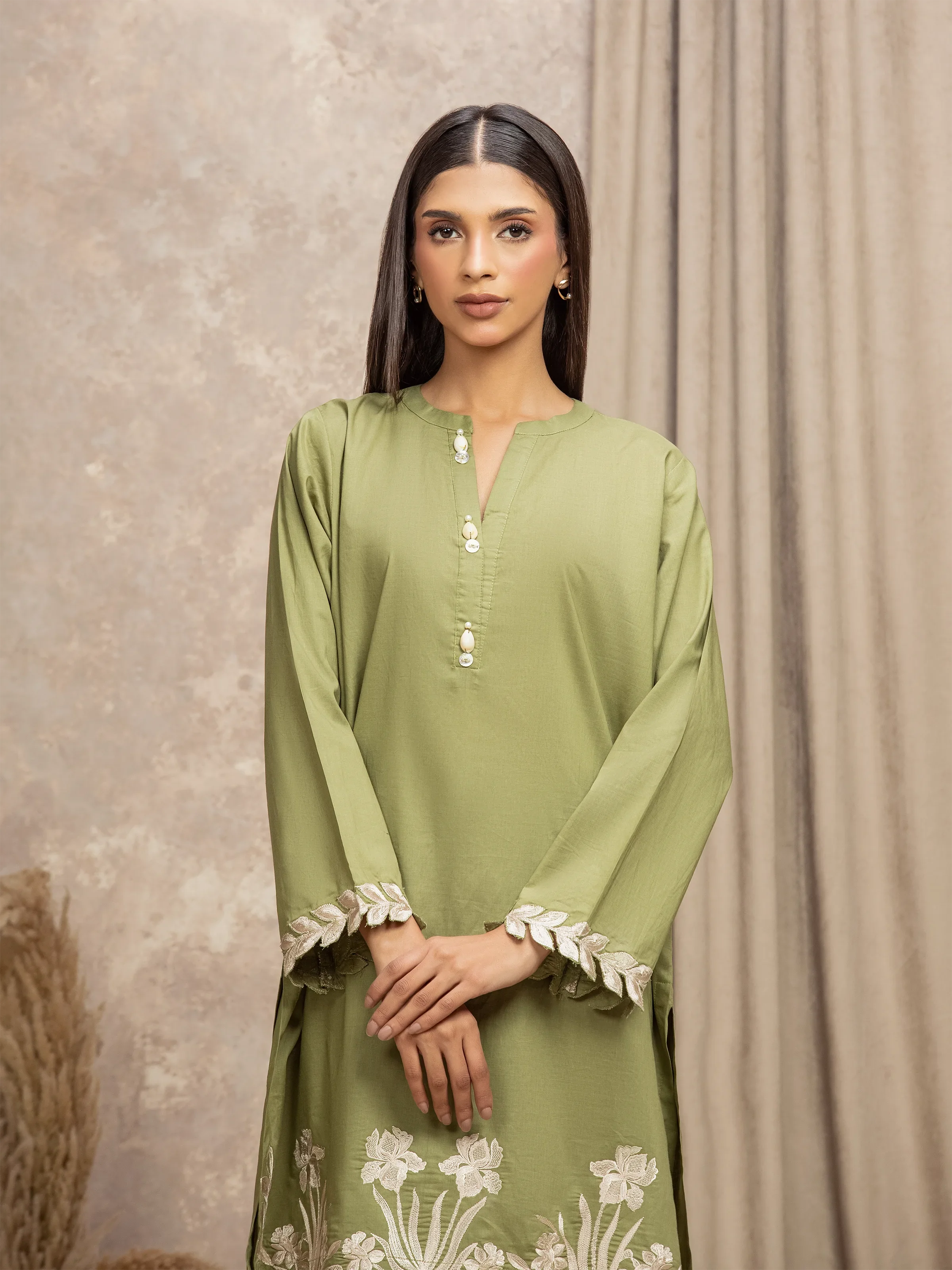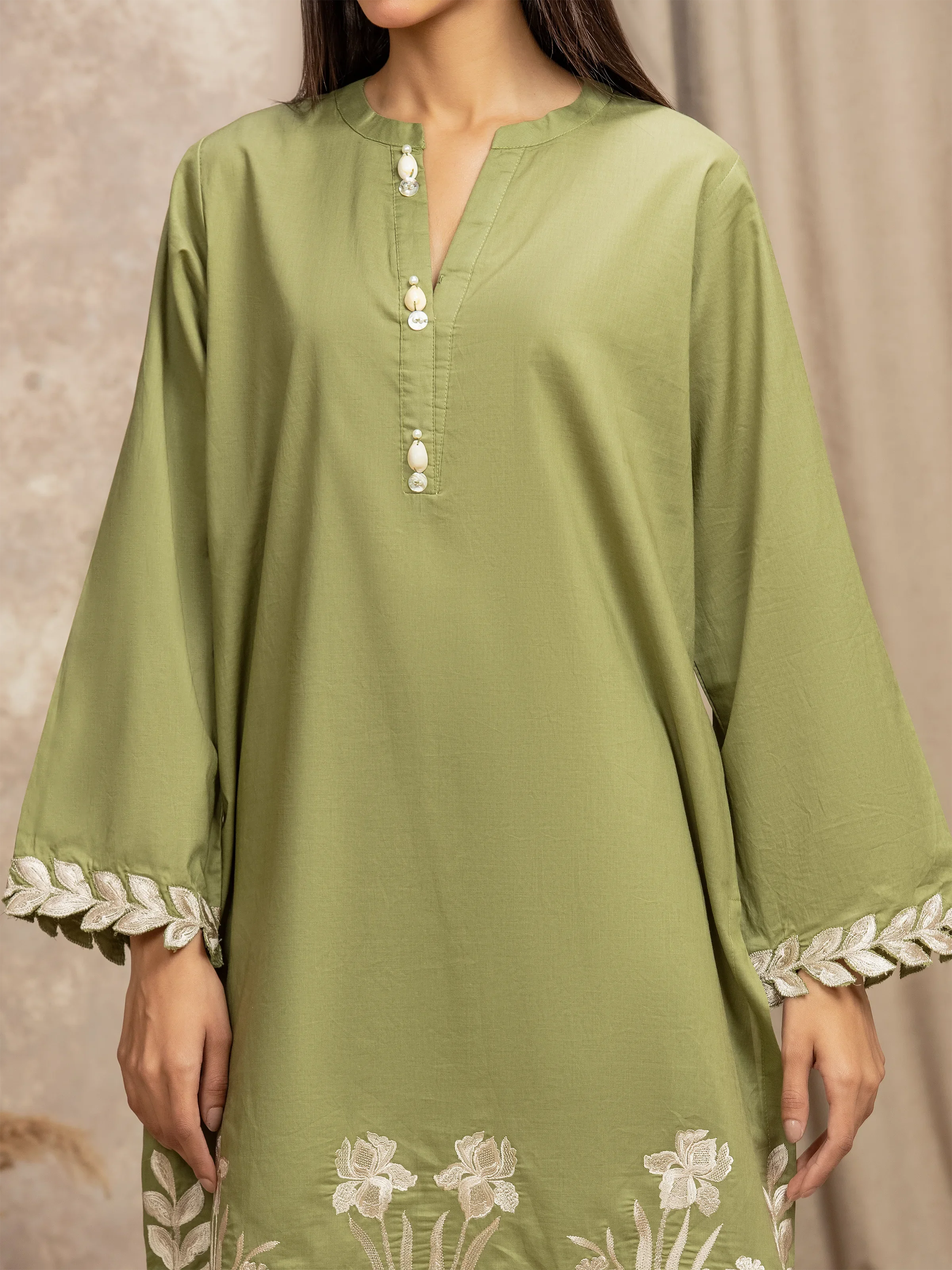 - Style:Β Plain Shirt with Embellished Placket, and Embroidered Sleeves & Daman