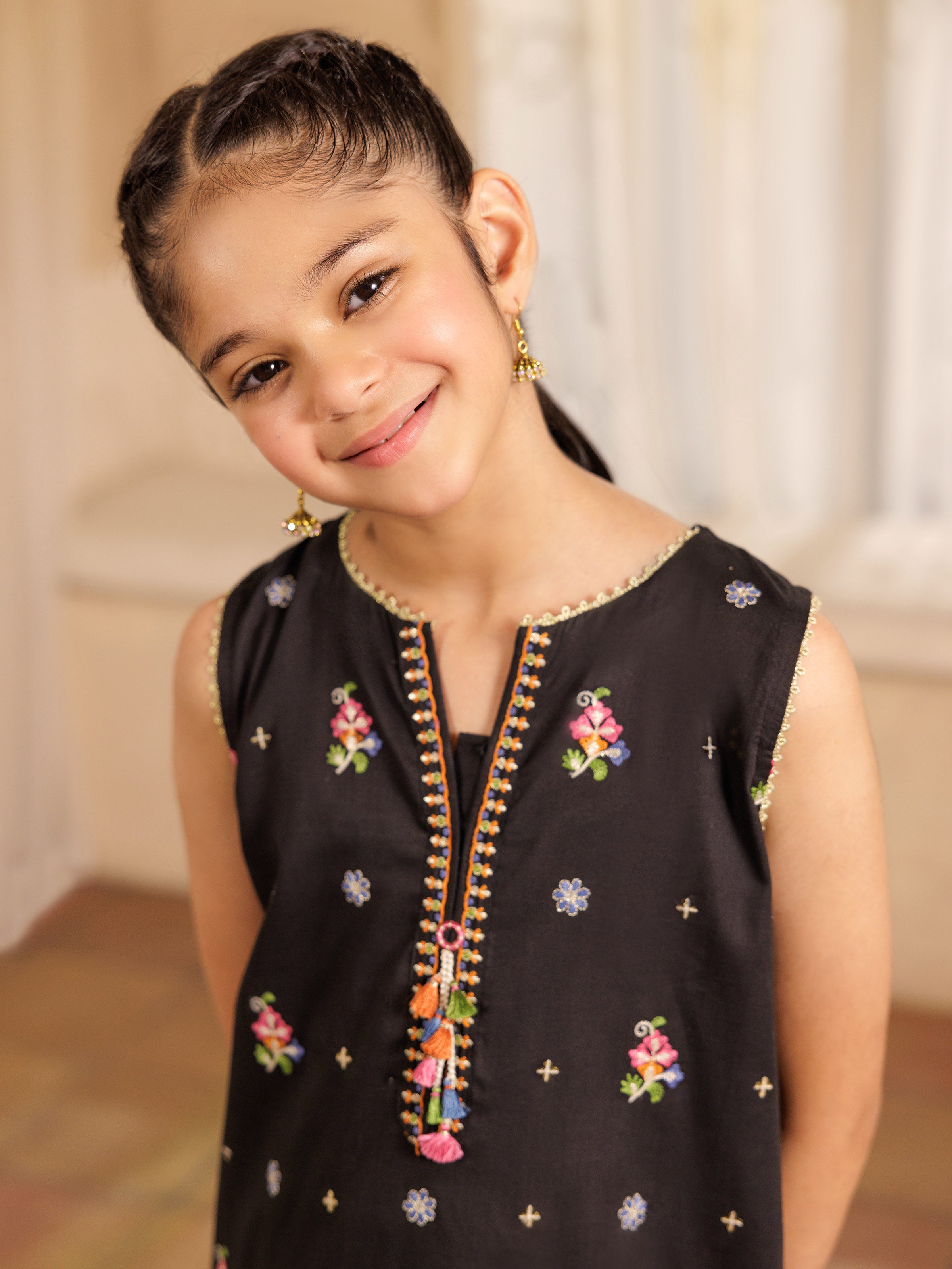 - Style: Embroidered Kurti with Tassels on Placket, Embellishments Bunch on Back, & Separate Embroidered Sleeves are Added